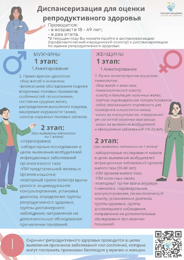 Михаил Мишустин утвердил программу государственных гарантий бесплатного оказания медицинской помощи гражданам на 2024 год и плановый период 2025 и 2026 годов, которая содержит направления по оценке репродуктивного здоровья граждан России. Для женщин и мужчин репродуктивного возраста поэтапно и одновременно с прохождением профилактического осмотра или диспансеризации организуется проведение диспансеризации, направленной на оценку их репродуктивного здоровья, с целью выявления признаков и факторов риска заболеваний или состояний, способных негативно повлиять на беременность, течение беременности, родов и послеродового периода. Первый этап диспансеризации по оценке репродуктивного здоровья включает: Для женщин: